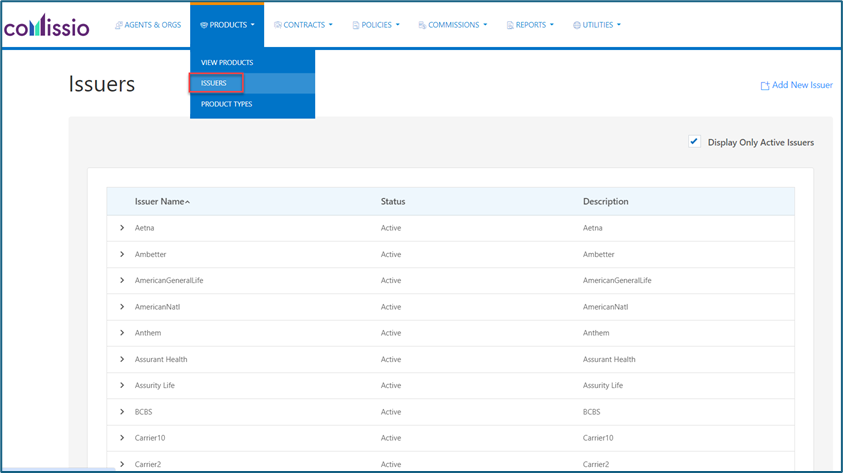 The Issuers page displays a table to display Carriers and other companies that will be used in Commissionable Products which then will be used to populate Policies and Commission Rates.
