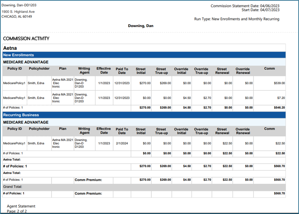The first change is the Commission Activity section when the Product Type is Medicare Advantage or Medicare Prescription have been changed to reflect the new Street and Override fields. The section for the Issuer > Product Type will still be broken down by New Enrollments and Recurring Business. The New Enrollments for MAPD/PDP will include all commissions for Initial and True-up, not just the first payment received. Recurring Business will display Street and Override renewal payments commissions.