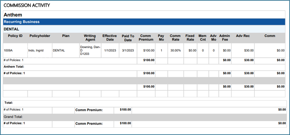 Example of Activity Section for non-MAPD Commission Activity for comparison