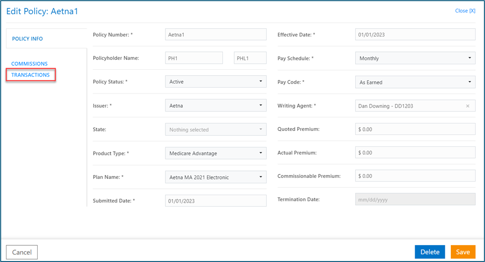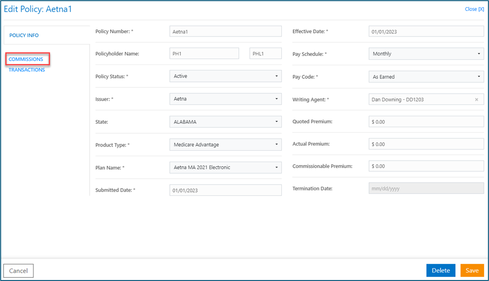The Policy detail page for MEDICARE and non-MAPD are the same, except that the Premium fields are not needed and can be left as $0.00. When the Policy is for a Medicare Advantage or Medicare Prescription Product Type, the Commission Distribution for the Policy is different.