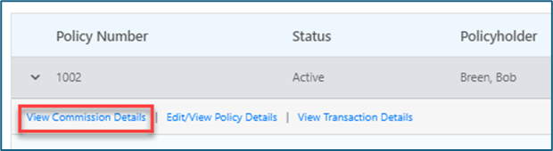 Policy detail page with link to Commissions (Commission Distribution) outlined