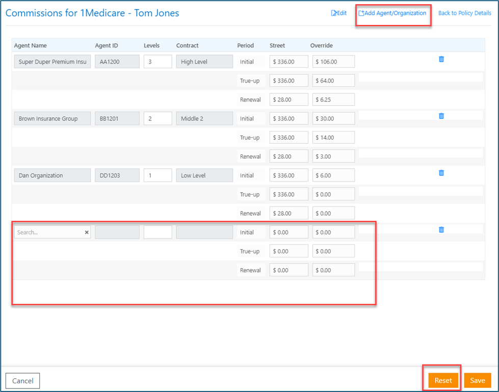 When editing a Commission distribution from the UI, rate amounts can be editing by changing values. Agents can be added by selecting Add Agent/Organization. Reset can also be used to use current values for Agent Hierarchy, Agent details or settings, and Commission Rates, to make the Commission Distribution.