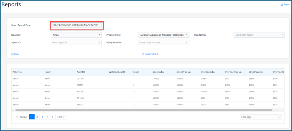 This report for MAPD/PDP only displays Policies for Policies with the two Medicare Product Types. The non-MAPD version of the Commission Distribution report will not display Policies for Medicare Product Types because of the differences in the rates.