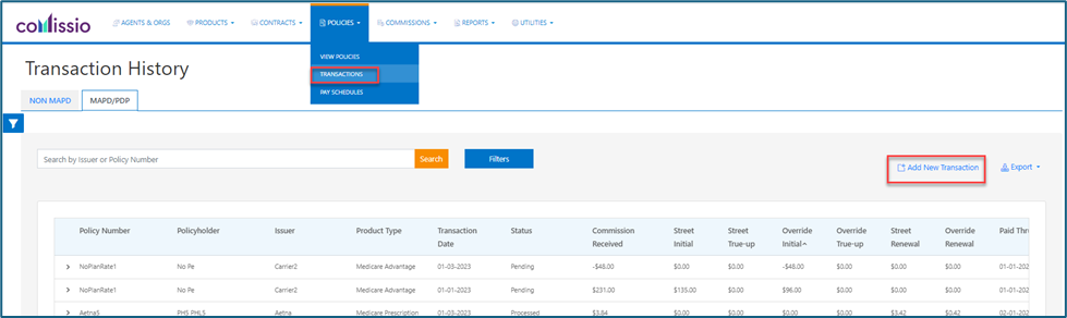 Commission Distribution page when Policy is MAPD or PDP Product Type