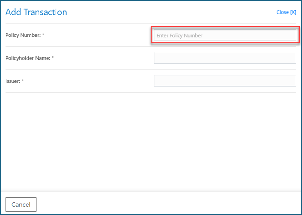 When ‘Add New Transaction’ is selected from this list page, the add transaction detail page that opens will at first only have an entry field for Policy Number and display fields for Policyholder Name and Issuer. Once the Policy Number is entered, the system will derive the Product Type from the Policy and display the appropriate fields for the Type.