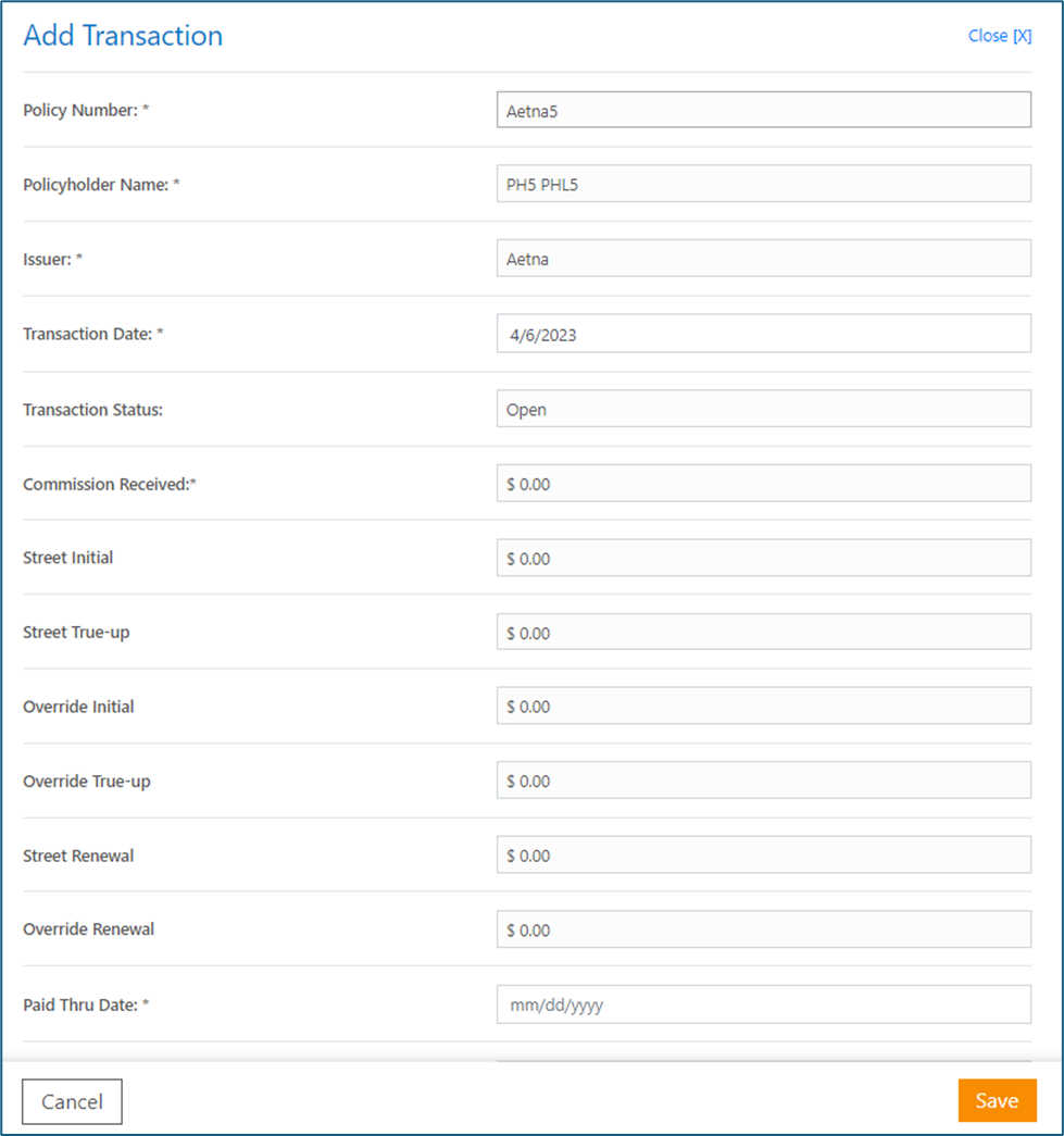 - Transaction Status – read only field for the status. For MEDICARE Policies that do not have the Street/Override fields populated to match the Commission Received amount, the status will be Unallocated. When the Street/Override fields have been populated correctly, the status will be Open, and the transaction can be picked up and processed within a cycle. Once a transaction is in a cycle that has not been closed, referred to as an ‘open cycle,’ then the status of the transaction will be Pending. If changes need to be made to one in pending status, the open cycle will be abandoned, the transaction will revert to Open, and the cycle will need to be run again. After a cycle is closed, the status in the transaction will be changed to Processed.