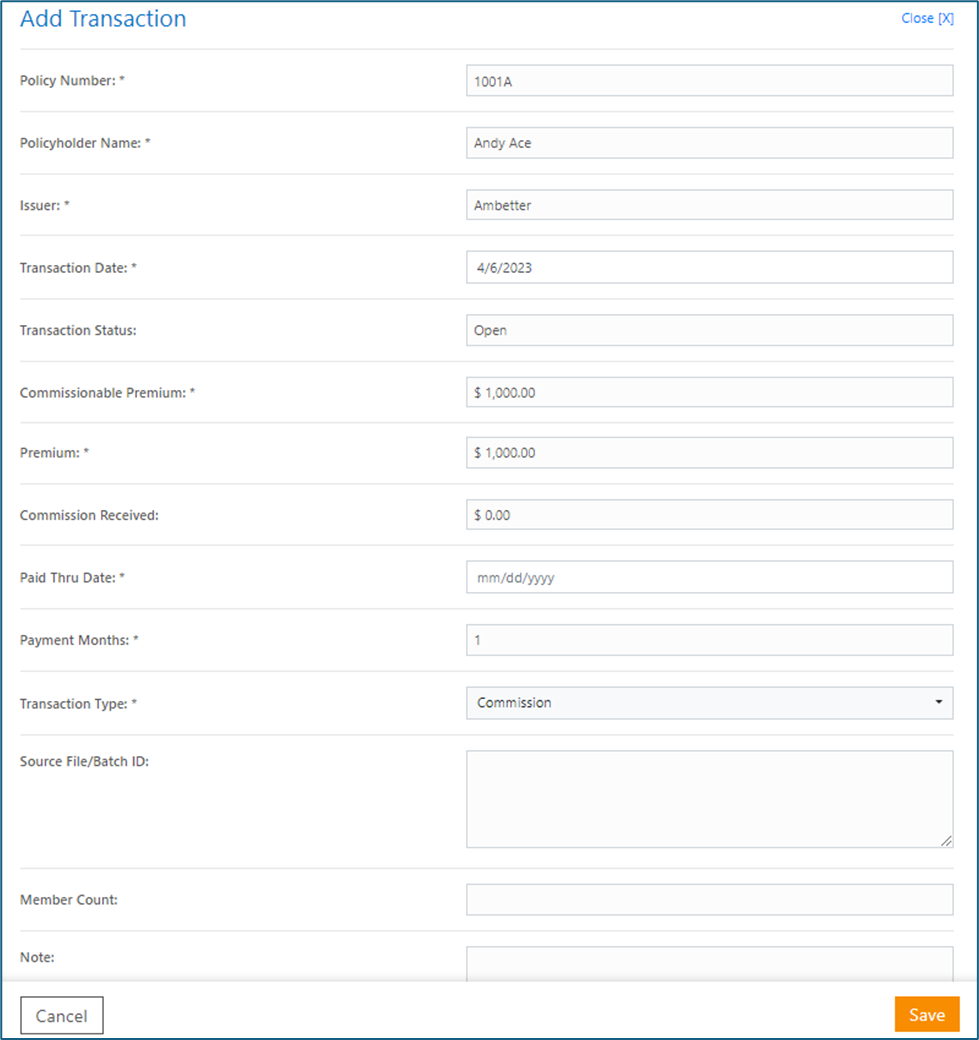 This import can also create duplicate transactions if the same transaction (amount and paid thru date) is entered but will give a warning. If a mistake is made beyond what is desired to fix manually through the UI, it is best to use the ‘Remove Imports’ process for Transactions to remove the original transactions and then re-import a corrected file. This will not remove the Policies that were created, just the transactions.