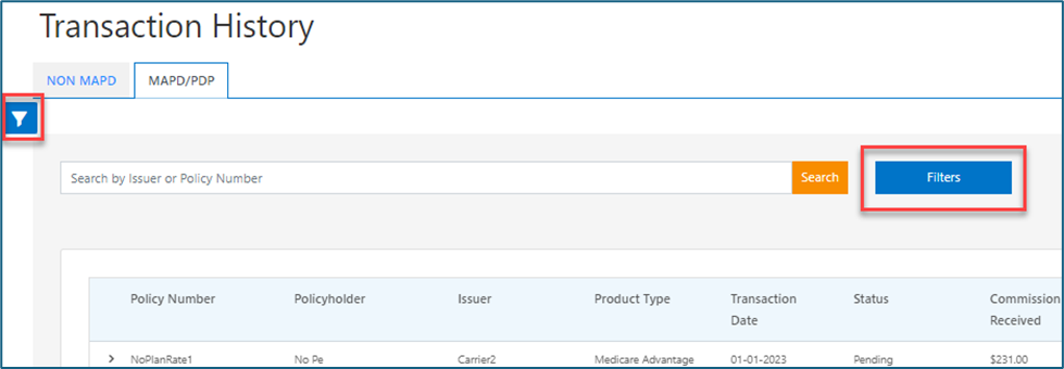 There is a filter or Advanced Search located in the transaction list page used across all policies. It can be opened by selecting the ‘Filters’ option or the ‘funnel icon’ located at the left. If either of those options is selected again it will close the filter.
