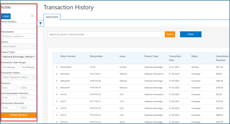 The filter has different fields where values can be entered or selected. Then when Update Results is selected the results will be displayed in the list page or pages. If the results are only of one type, like only for Medicare Advantage and Medicare Prescription Product Types, then only the tab and list for that type will be displayed. If both MEDICARE and non-MAPD then the search results will display in the appropriate list page under the tab appropriate for the transaction type.