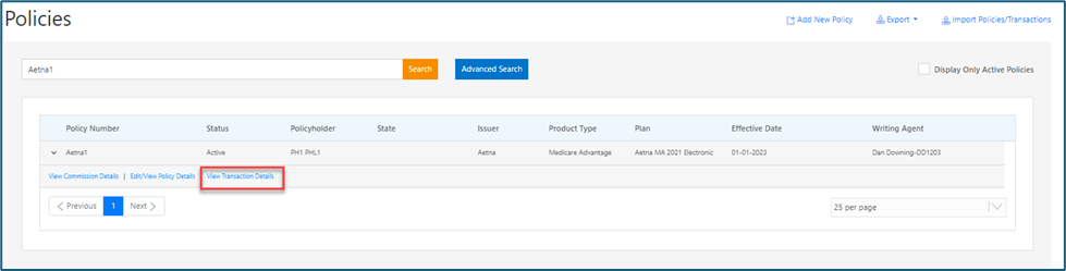Note: when creating a Policy in the UI, you can directly go to the transaction link to create transactions as the system will save the Policy before going to the transaction list page.