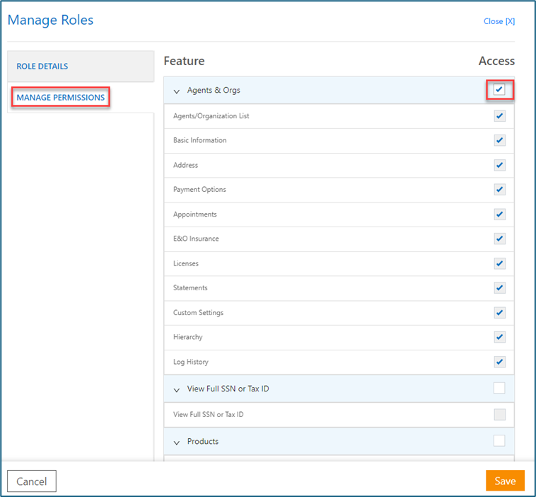 The View full SSN or Tax ID can only be selected when the Agents & Orgs permission is also selected. This will allow an Admin in an Agent Detail page to select an ‘eye’ icon to view the full tax ID instead of just see the last four digits.