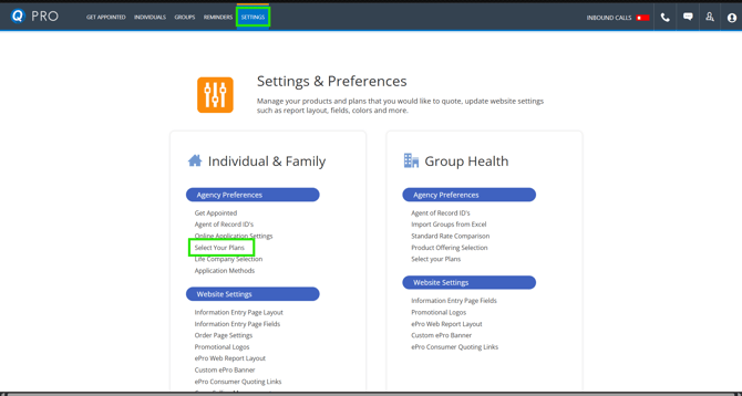 - Click "Settings" at the top of your Quotit account, then click "Select Your Plans".