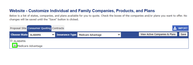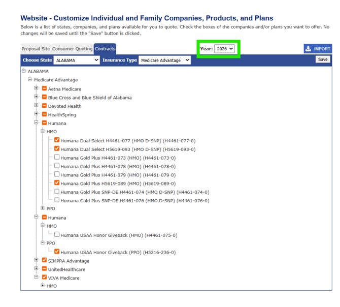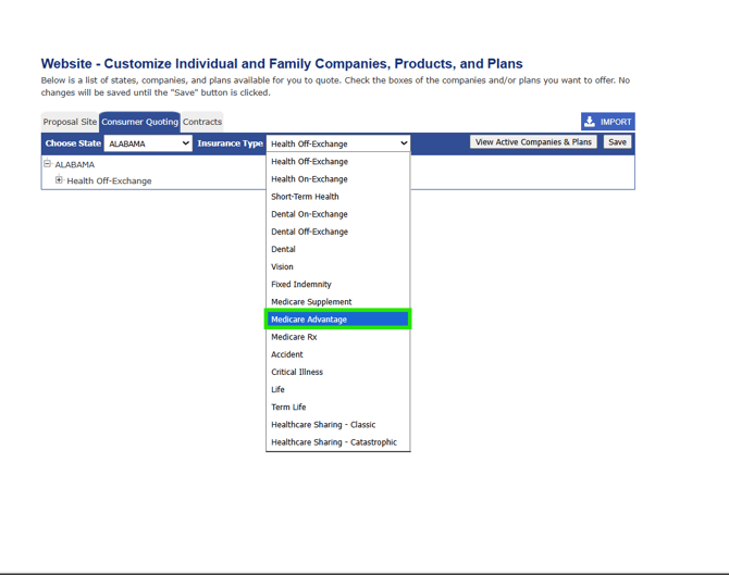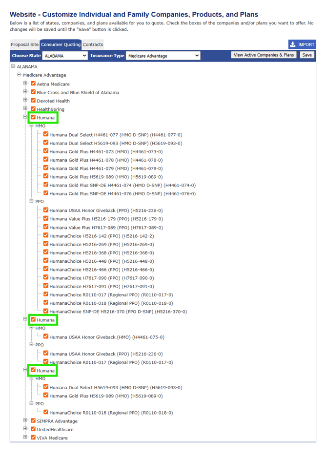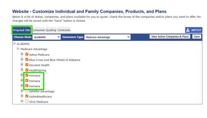 - Next, Click on the "Proposal Site" tab above the "State" dropdown we used earlier. Here you can expand the Medicare Advantage Menu and turn on Humana. Click "Save".