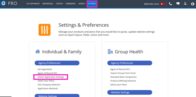 Note: Not all Quotit accounts are able to sell Medicare Advantage. If your account does not have the Medicare Advantage product and you would like to add that to your account, please reach out to the Support Team at customer.support@quotit.com, or by calling 866-478-6848. Support hours are Monday - Friday, 6A - 5P PST. - Click “Settings” in top row menu to get to the “Settings and Preferences” page.