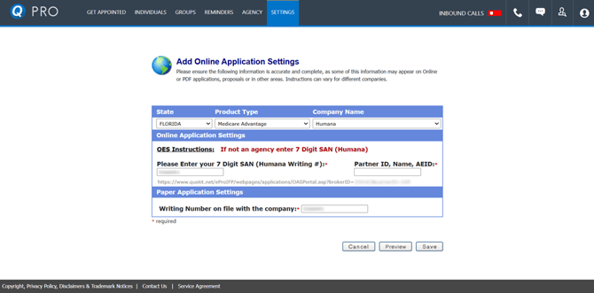 - You should next see a page with the title “Add Online Application Settings”. Select a State, Product type: Medicare Advantage (Note: you will need to repeat this process for Medicare RX), and Company Name: Humana. This will cause the page to present fields to enter your 7 Digit Humana Writing Number, and your Partner ID, which you may have received by email from the carrier.
